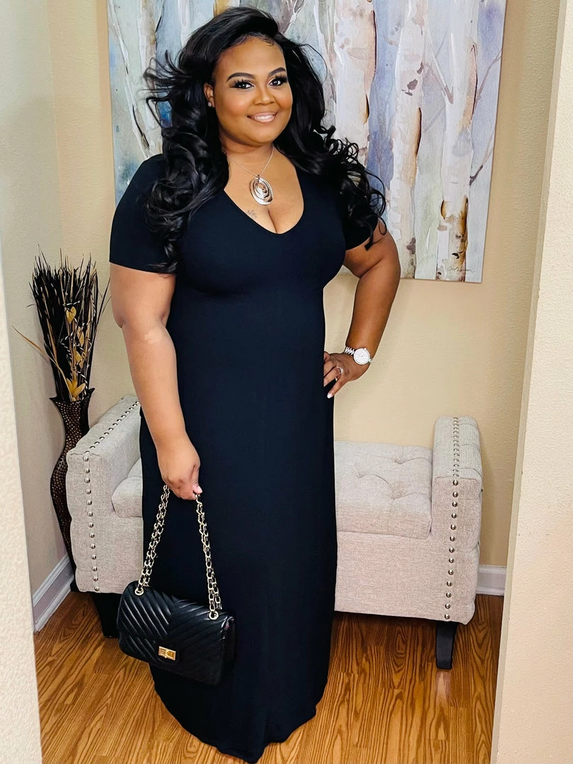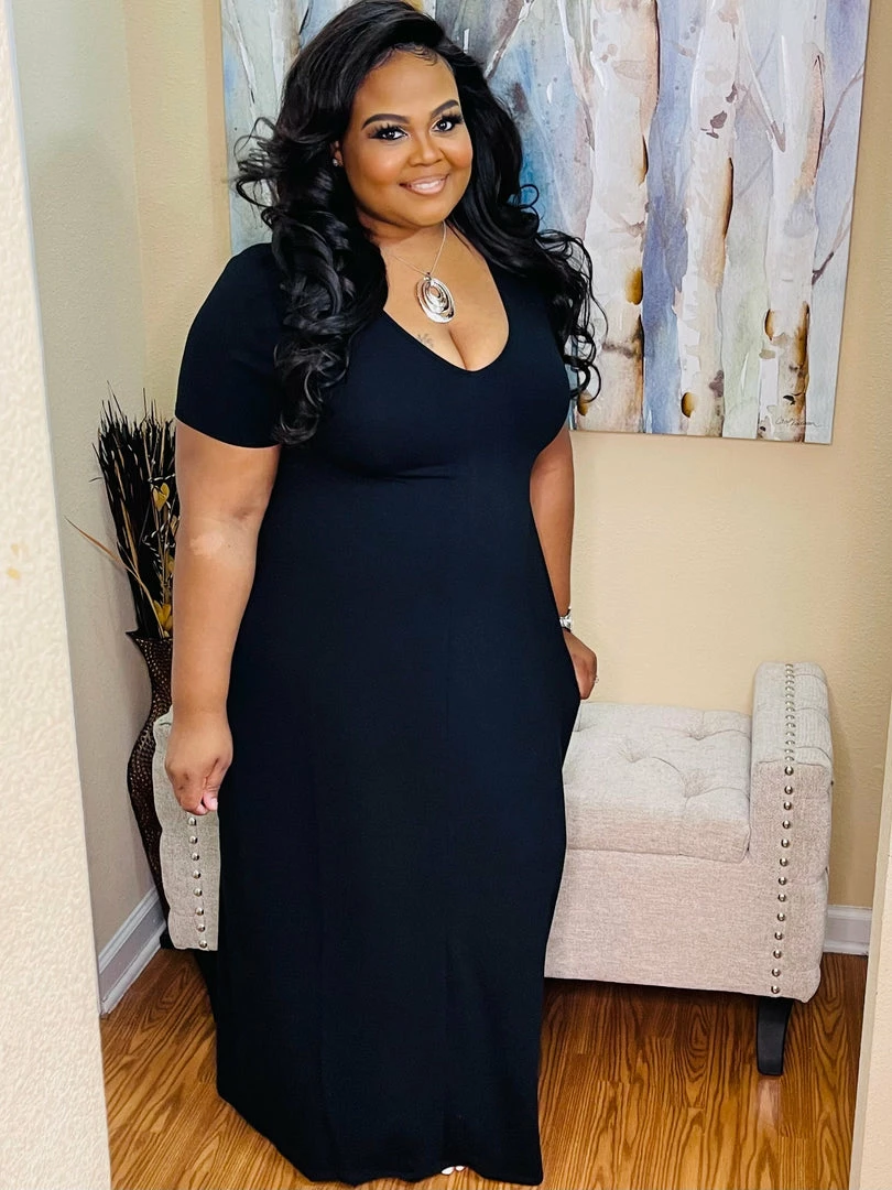 - Black , Premium Fabric V-Neck Short Sleeve Maxi Dress With Side Pockets