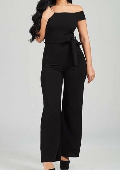 Solid off the shoulder wide leg jumpsuit with tie waist.