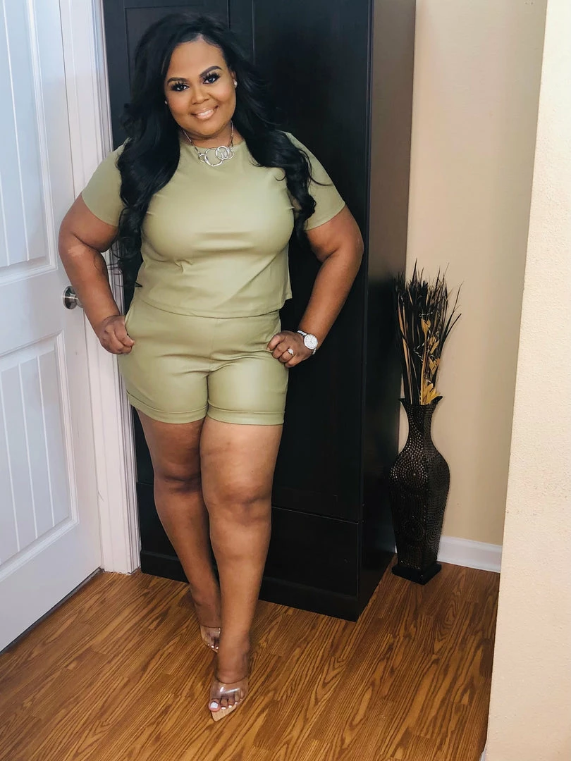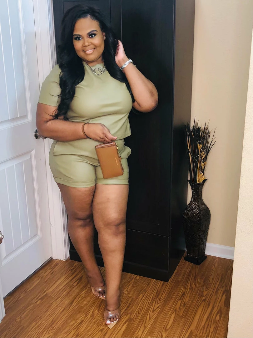- LEATHER SHORT SLEEVE ROUND NECK TOP & PAPERBAG WAIST SHORTS