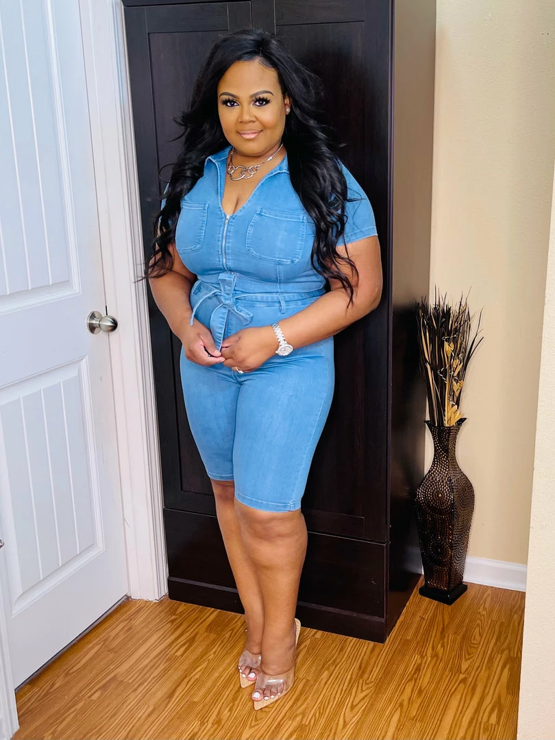 - SHORT SLEEVE BIKER SHORT DENIM ROMPER WITH ZIPPER FRONT AND WAIST TIE.