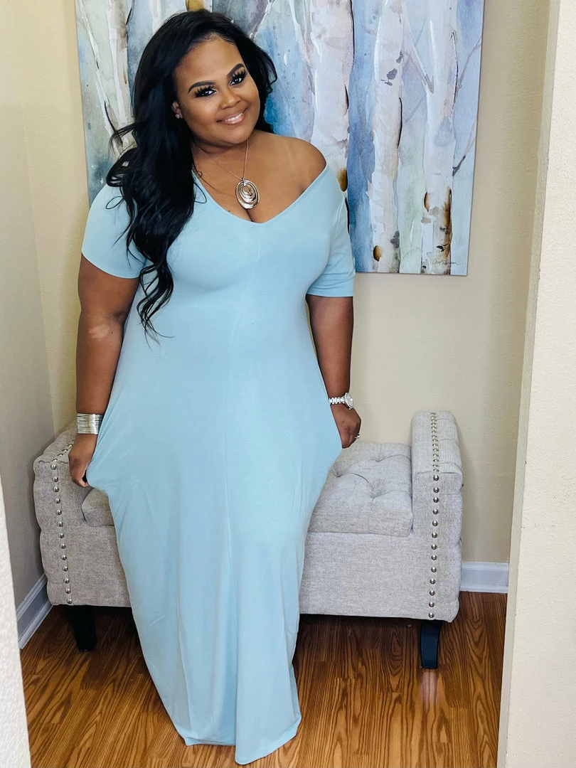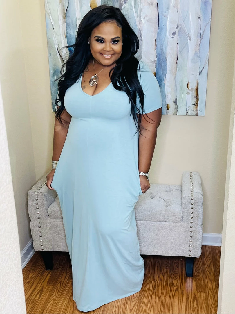 - Premium Fabric V-Neck Short Sleeve Maxi Dress W/Side Pockets
