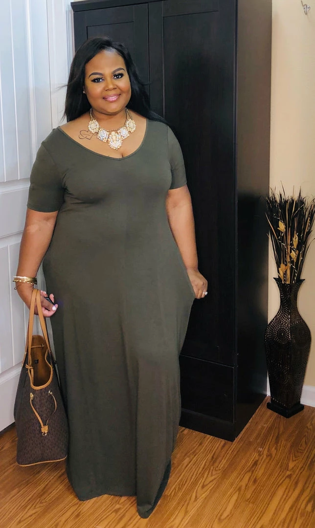 - Dark Olive ,Premium Fabric V-Neck Short Sleeve Maxi Dress With Side Pockets
