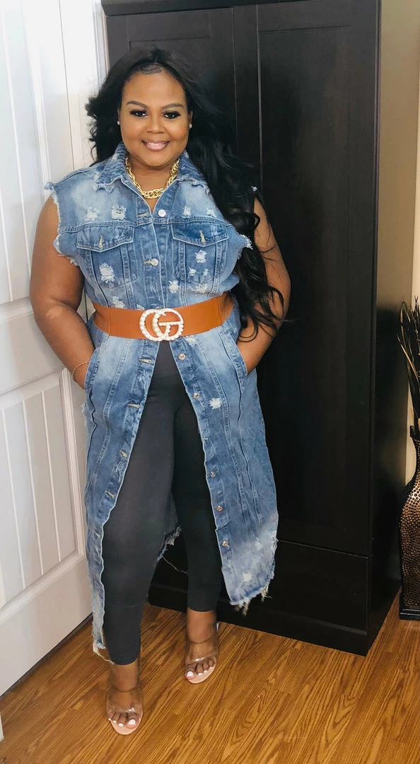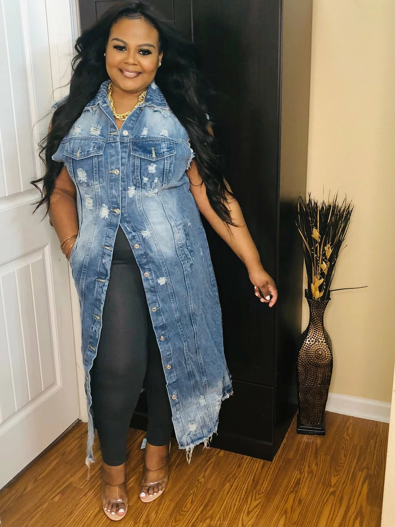 - SLEEVELESS DESTROYED DENIM VEST LONG JACKET