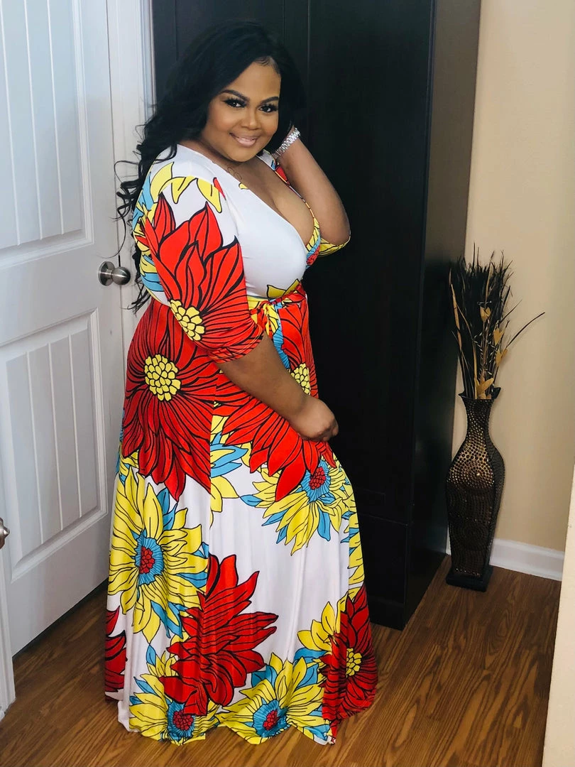 - Floral printed wrapped maxi dress with v-neckline, waist tie, and 3/4 sleeves