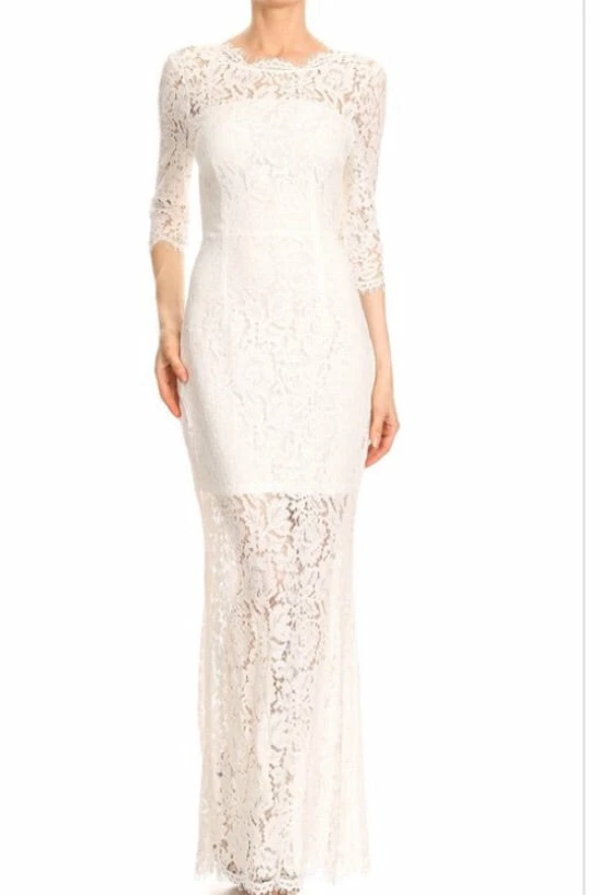 Description: Lace sheath maxi dress with high neck detail, 3/4 sleeves, cut out at back, and button and zipper closure at back
